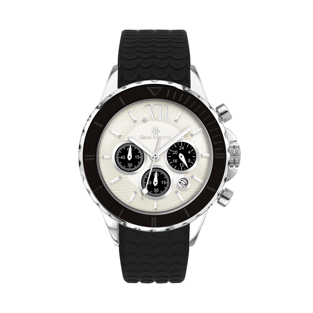 316L 不鏽鋼錶殼,黑色陶瓷錶圈,銀色配黑色 MOP 錶盤,38 毫米錶殼尺寸,日本計時機芯,9 點鐘位置設有 60 分鐘計時盤,6 點鐘位置設有 60 秒計時盤,3 點鐘位置設有 24 小時指示,4.5 點鐘位置設有日期顯示,黑色矽膠錶帶,黑色矽膠錶帶,黑色玻璃殼,黑色玻璃殼,黑色護木錶帶黑色水晶錶帶,黑色玻璃寶石。