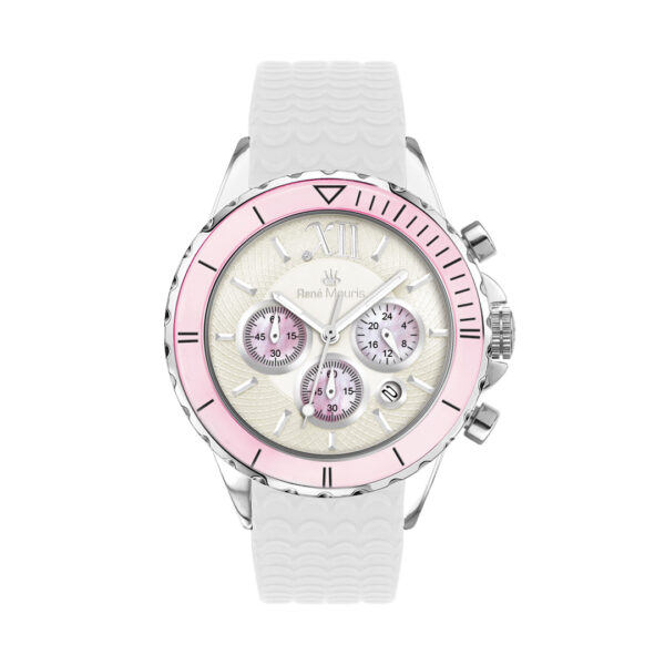 316L不鏽鋼錶殼,粉紅色陶瓷錶圈,銀色錶盤搭配粉紅色MOP錶盤,38毫米錶殼尺寸,日本計時機芯,9點鐘位置設有60分鐘計時盤,6點鐘位置設有60秒計時盤,3點鐘位置設有24小時顯示,4.5點鐘位置設有日期顯示,白色水晶膠帶,藍寶石錶帶50玻璃錶。