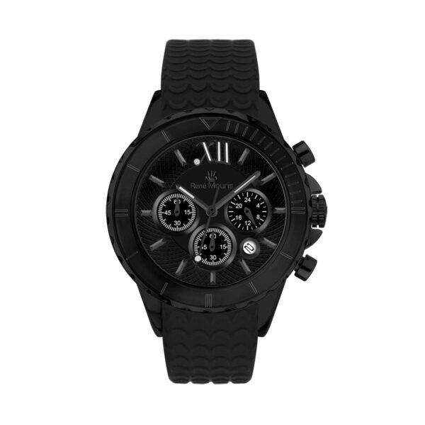 PVD 黑色錶殼,黑色陶瓷錶圈,黑色 MOP 錶盤,38 毫米錶殼尺寸,日本計時機芯,9 點鐘位置設有 60 分鐘計時盤,6 點鐘位置設有 60 秒計時盤,3 點鐘位置設有 24 小時顯示,4.5 點鐘位置設有日期顯示,黑色矽膠錶帶,藍寶石 50 米,防水玻璃。