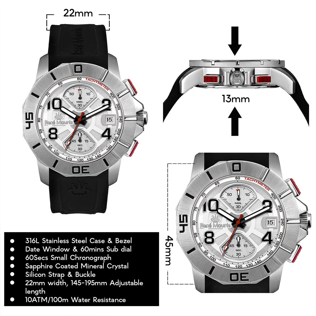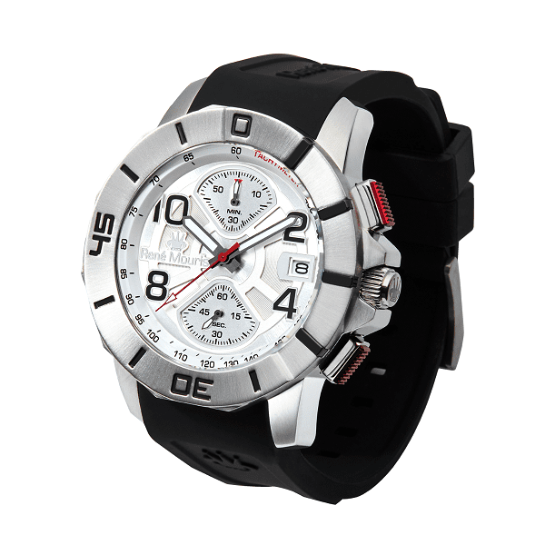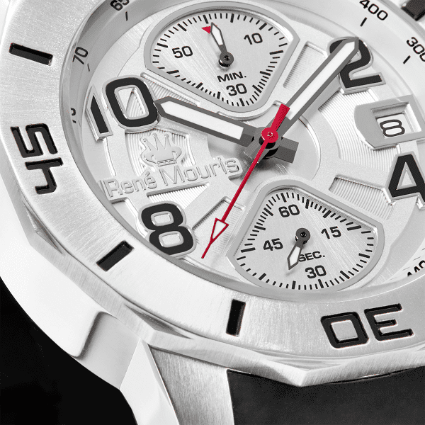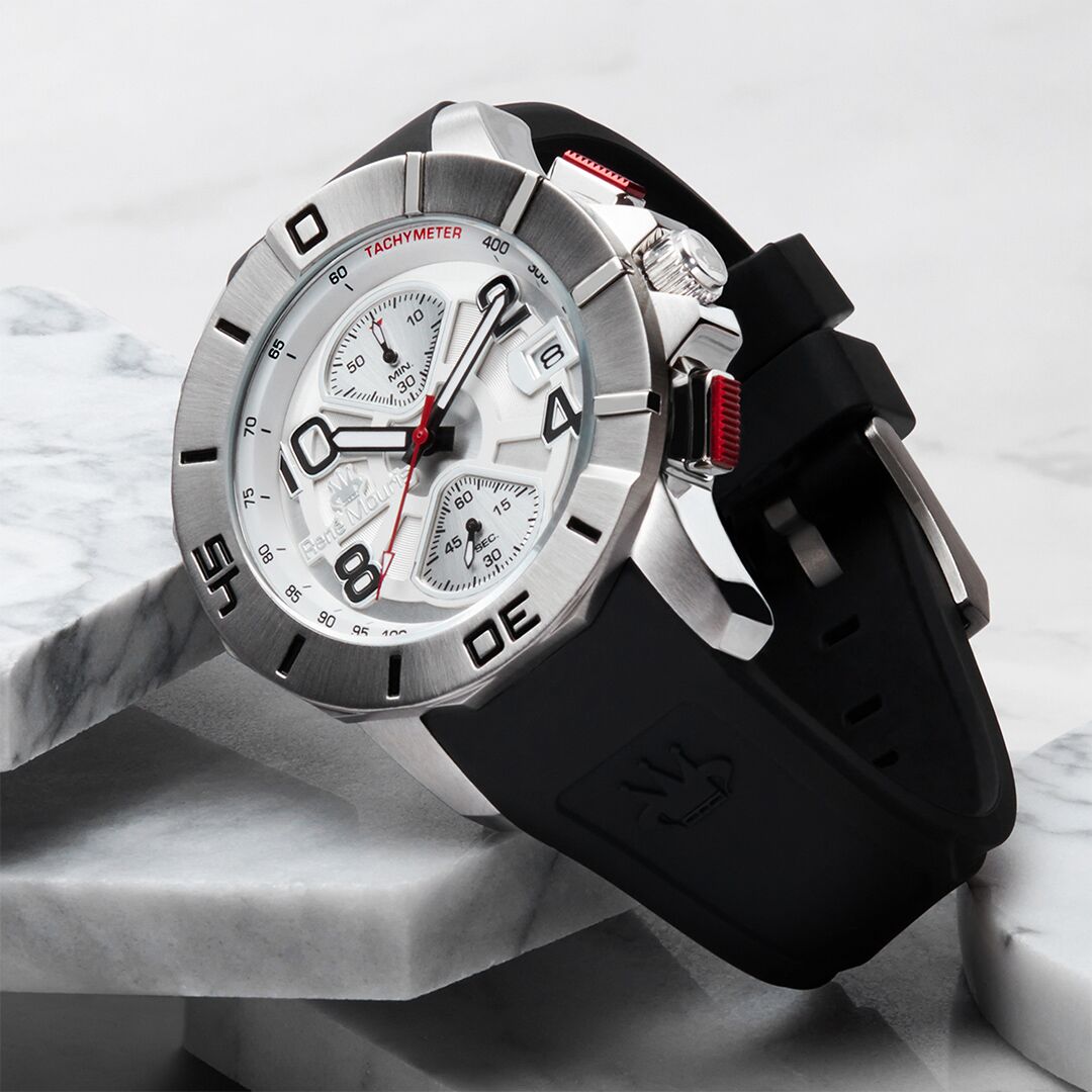 勝利的選擇……René Mouris 無限計時碼錶展現了大膽的風格和堅固的外觀。厚實的鋼製錶殼搭配斜面玻璃和高性能矽膠錶帶。可選擇不銹鋼和黑色PVD款式,搭配相配或對比的錶圈。你會對其品質和選擇感到驚嘆